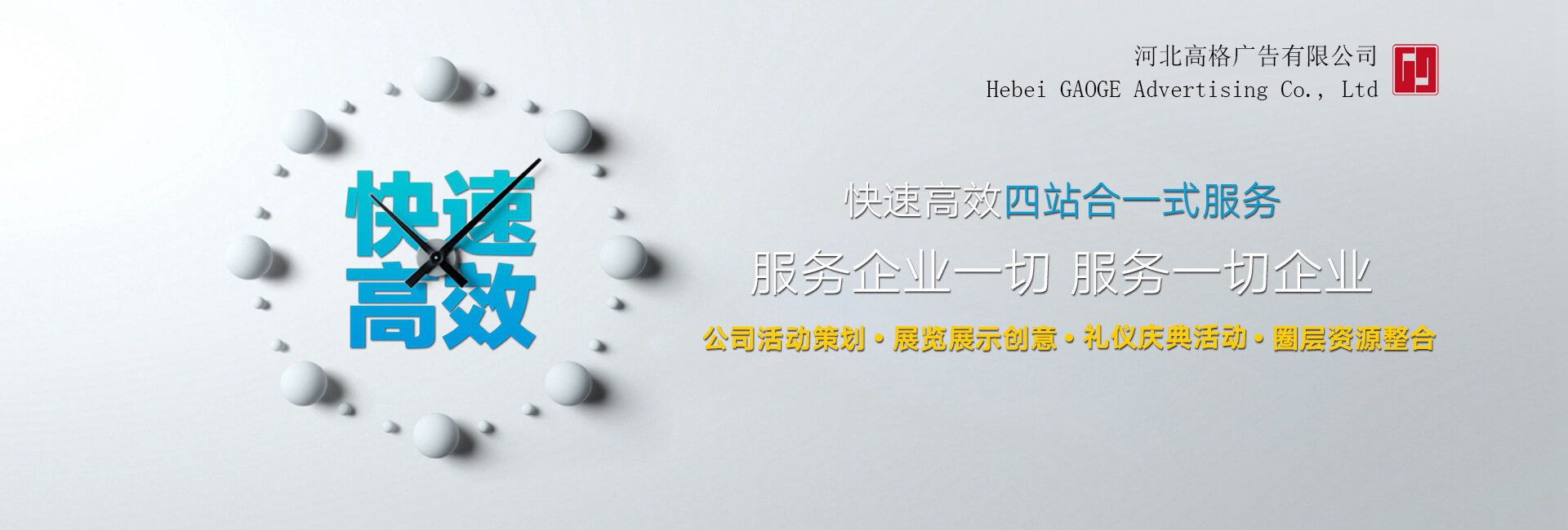 河北高格廣告有限公司是一家專業(yè)致力于大型文化活動組織策劃、展覽展示工程策劃、展臺設(shè)計制作、特裝展臺搭建、會議會場布置、巡回展覽、路演、公關(guān)推廣執(zhí)行、會議慶典禮儀、路演設(shè)備租賃、倉儲等一站式的專業(yè)服務(wù)公司。本公司憑借創(chuàng)新領(lǐng)先的服務(wù)理念,大型的廠房空間,現(xiàn)代化的機(jī)械設(shè)備,高素質(zhì)專業(yè)的服務(wù)團(tuán)隊,及在該行業(yè)多年的實戰(zhàn)經(jīng)驗,為地產(chǎn)營銷提供了優(yōu)秀的活動方案、為不同行業(yè)的數(shù)千家企業(yè)提供了專業(yè)個性化的空間展示方案,幫助客戶實現(xiàn)了自我品牌的提升和企業(yè)利潤的雙贏。...